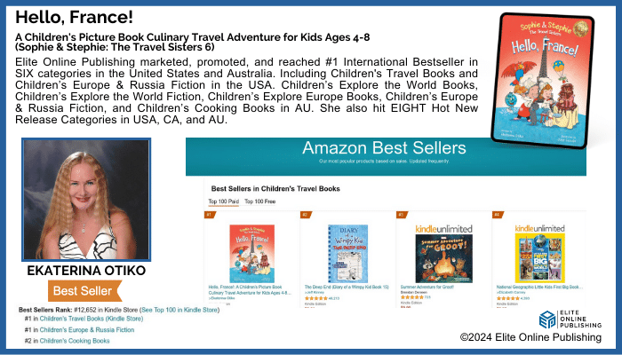 Elite Online Publishing marketed, promoted, and reached #1 International Bestseller in SIX categories in the United States and Australia. Including Children’s Travel Books and Children’s Europe & Russia Fiction in the USA. Children’s Explore the World Books, Children’s Explore the World Fiction, Children’s Explore Europe Books, Children’s Europe & Russia Fiction, and Children’s Cooking Books in AU. She also hit EIGHT Hot New Release Categories in the USA, CA, and AU.